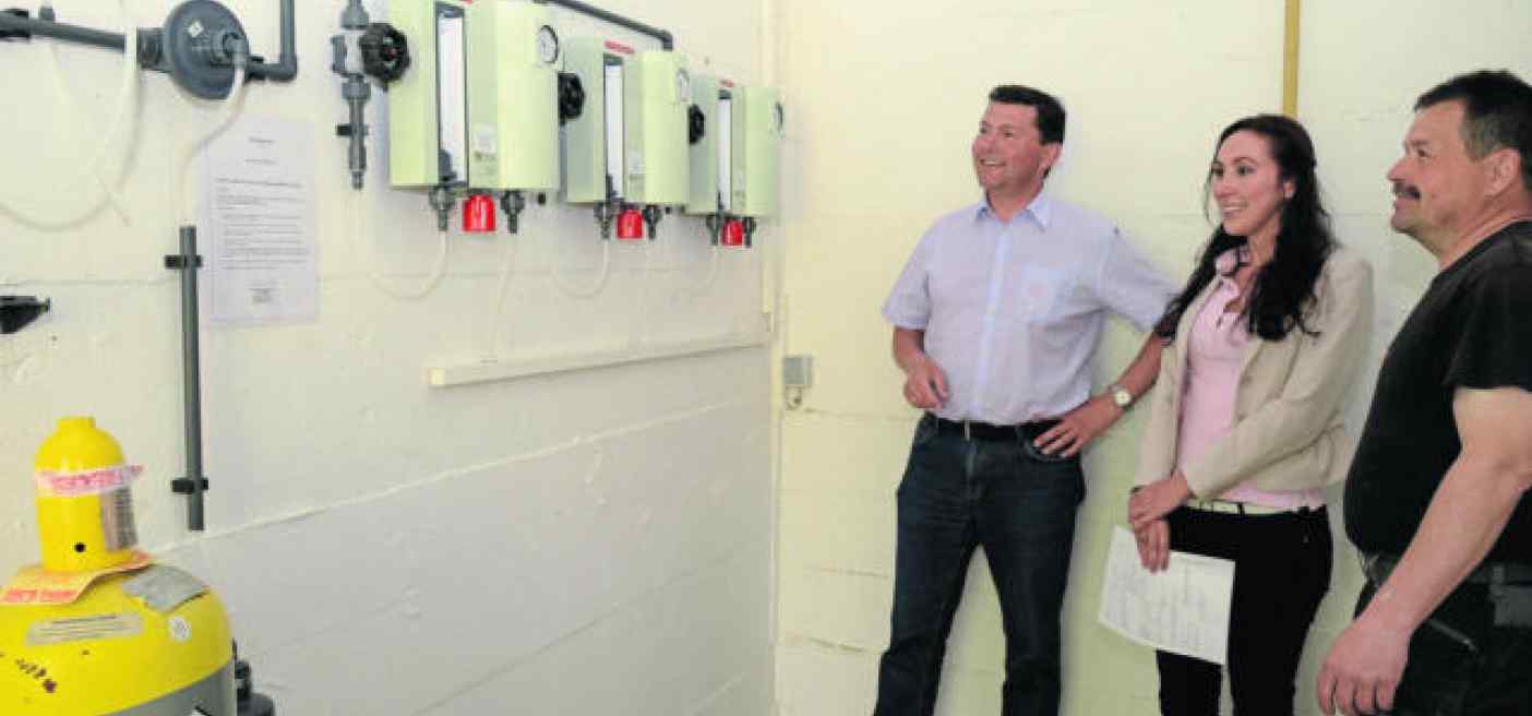 Das neue Chlorgas-Dosiersystem arbeitet mit Unterdruck, so dass kein Gas unkontrolliert austreten kann. Dieses Vollvakuumprinzip bedeutet höchste Betriebssicherheit. Falls es doch einmal zu einem Leck kommen sollte, wird nur Luft angesaugt, ohne dass Gas austritt. Bürgermeister Rainer Rewitzer, Kämmerin Stefanie Polat-Schieder und Bademeister Hubert Rewitzer stellten diese neue technische Errungenschaft der Freizeiteinrichtung vor, die auch mit den erhöhten Eintrittsgeldern finanziert wurde.